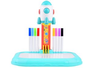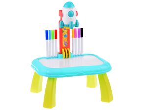 Projektor w kosmicznej odsłonie to świetna propozycja dla małych artystów, którzy uwielbiają rysować. Rzutnik ma regulowany kąt nachylenia oraz wysokość dlatego można go używać na samej tablicy jak i wyświetlać obrazki na ścianie. W górnej części rzutnika znajduje się projektor w kształcie rakiety, po włączeniu przycisku znajdującego się z przodu rakiety, włączy się światło, które pozwoli na wyświetlanie gwiezdnego nieba na ścianie, suficie. Po wciśnięciu przycisku jeszcze raz włączy się projektor dzięki któremu będziemy mogli wyświetlić obrazki takie jak kosmiczny świat, zwierzęta, pojazdy oraz podwodny świat. Rzutnik posiada blat na którym dziecko będzie mogło poukładać pisaki, i rysować, odrysowywać wyświetlane obrazki z rzutnika. Tablica została bardzo ładnie wykonana sprawi wiele frajdy podczas zabawy. Świetna zabawa zapewniona.Za pomocą rzutnika można- kopiować wyświetlane obrazki na kartce, przez co dziecko ćwiczy dłoń i rysunek,- wyświetlać można także obrazki na ścianie i tworzyć różne opowiadania- wyświetlać gwiazdyZestaw posiada- 8 kolorowych pisaków- 4 komplety wzorów do rzutnika- kartki do malowania- tablica rzutnikObrazki załączone do rzutnika przedstawiają min.:- kosmiczny świat- zwierzątka- pojazdy- podwodny światWymiary:- całość: 31 cm x x 25 cm x 20 cm x- pole do rysowania : 19,5 cm x 14 cm- wysokość ramienia rzutnika: 16 cm