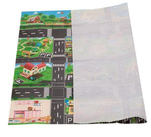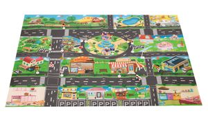 Duża wodoodporna mata dla dzieci z wzorem miasta i akcesoriami.Wykonana z tworzywa sztucznego przypominającego ceratę, jest bardzo cienka i lekka. Zestaw zawiera m.in. 18 różnych znaków drogowych, oraz 18 naklejek. Wymiary: 130 x 100cm