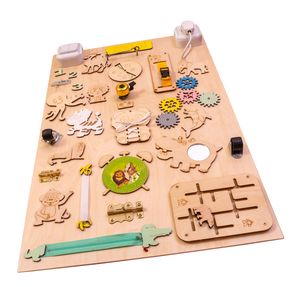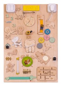 Dwustronna tablica sensoryczna z motywem zoo. Jedna strona jest manipulacyjna, a druga magnetyczno-kredowa - pozwala to na rozwój wielu umiejętności manualnych, i to za sprawą jednej zabawki. Tworzywo: drewno. Wym.: 50 cm x 75 cm x 50 cm.