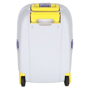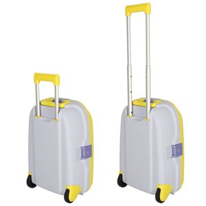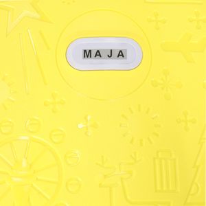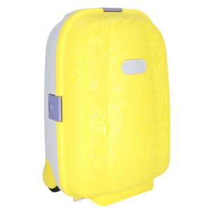 Żółta walizka dziecięca na kołkach - idealna na każdą podróż. Wyposażona w dwa kółka oraz wysuwaną rączkę. Zamykana na trzy zatrzaski. W zestawie naklejki umożlwiające podpisanie walizki. Tworzywo: plastik. Wymiary: 43 cm x 30 cm x 19 cm.